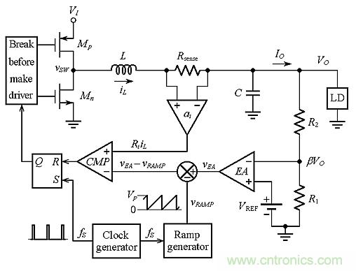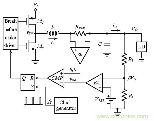 圖3:不帶斜率補償?shù)腜CMC降壓轉(zhuǎn)換器的電路原理圖。