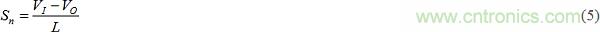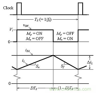 當一個時鐘脈沖置位觸發(fā)器時,開始一個周期。這將關(guān)閉Mp開關(guān),使vSW=VI。在該周期的這一部分(在圖4中表示為DTS),電感器電流iL以斜率Sn上升,由iL-vL電感法則掌控,或Sn=diL/dt=vL/L。在這段時間,我們得到vL=VI– VO,所以: