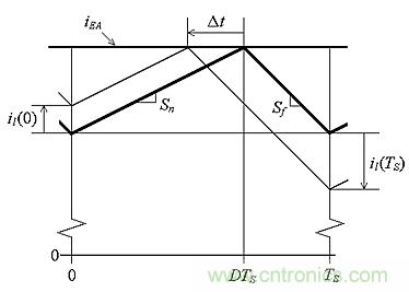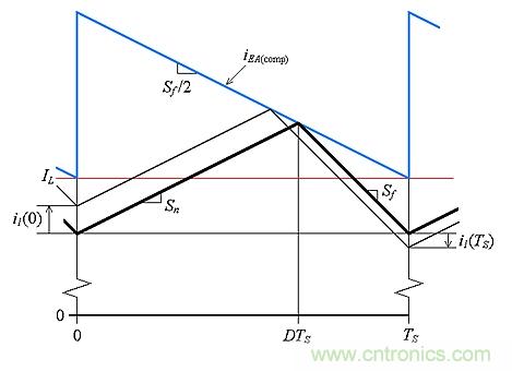 這樣,我們僅以電流形式就可以顯示一個周期,如圖4所示?,F(xiàn)在,復(fù)位觸發(fā)器打開Mp開關(guān),同時關(guān)閉Mn開關(guān),使vSW= 0。在表示為(1–D)TS的周期其余部分,我們有vL=0–VO,所以iL以Sf的斜率下降,因此有: