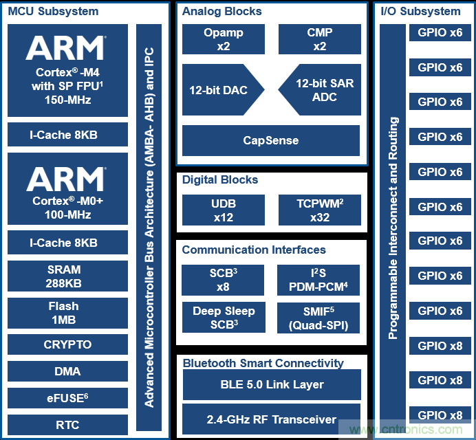 擴充處理器容量、內(nèi)存及功耗方面的性能不會憑空而來。對于許多應用程序而言,底層硬件(例如MCU)需要做出相應調(diào)整以適應這些特性。因此,生產(chǎn)商在設計下一代MCU時必須時刻緊記這些要求。例如,賽普拉斯 PSoC 6 BLE MCU(見圖1)為物聯(lián)網(wǎng)設計人員提供BLE 5.0所具備的這些功能。
