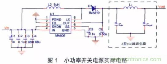 設(shè)計(jì)電路如圖1 所示,測(cè)試時(shí)輸入端使用3.6 V 的鋰電池進(jìn)行供電,使用π 型CLC 低通濾波電路對(duì)MAX606 輸出端進(jìn)行紋波濾波。