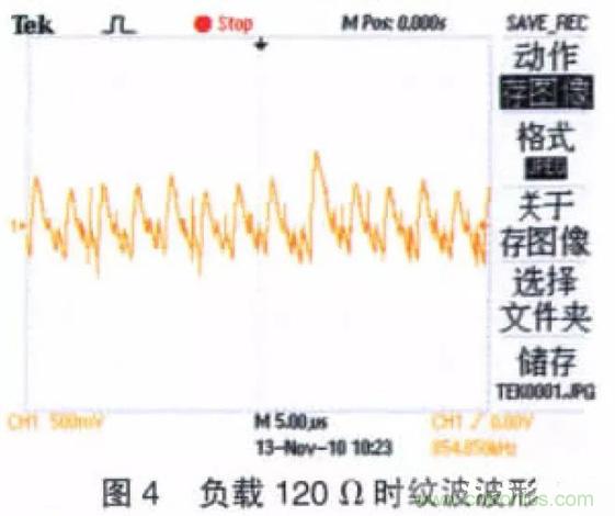圖3 所示為空載時(shí)MAX606 輸出電壓紋波波形(Uo≈12 V),即開(kāi)關(guān)紋波,其頻率為1.18 kHz,波形穩(wěn)定,Vpp=240 mV。圖4 所示為負(fù)載120 Ω 時(shí)輸出電壓的紋波波形,從圖4 中可以看出加入負(fù)載后電源紋波變得比較復(fù)雜,其最高Vpp達(dá)到1.2 V。為系統(tǒng)供電時(shí),該紋波將會(huì)對(duì)系統(tǒng)造成嚴(yán)重危害,必須對(duì)此紋波進(jìn)行抑制。