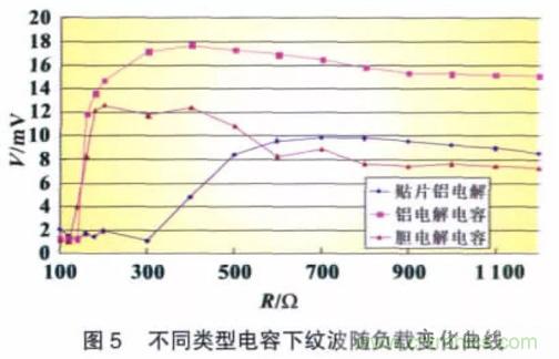 在圖1 的CLC 濾波電路中,Cin、Cout 分別使用三種常見(jiàn)類(lèi)型的電解電容(容值為220 μF/16 V),電感使用環(huán)形電感(電感值120 μH),依次改變負(fù)載大小,使用交流毫伏表測(cè)量其紋波電壓有效值,得到如圖5 所示的曲線(xiàn)圖。