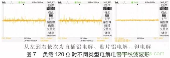圖6 所示為負(fù)載是300 Ω 時(shí)不同類(lèi)型電解電容下所測(cè)量到的紋波波形,可以明顯看出使用貼片鋁電解紋波最小,使用普通鋁電解紋波較大且紋波具有毛刺,使用貼片鉭電解紋波有所減小且毛刺也有很大程度的改善。
