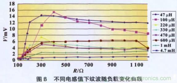 電容固定(貼片鉭電解220 μF/16 V),改變圖1 中CLC 濾波電路的電感值大小,測(cè)量不同負(fù)載時(shí)紋波的有效值,得到如圖8 所示的曲線(xiàn)圖,其中電感使用的是弓形電感。