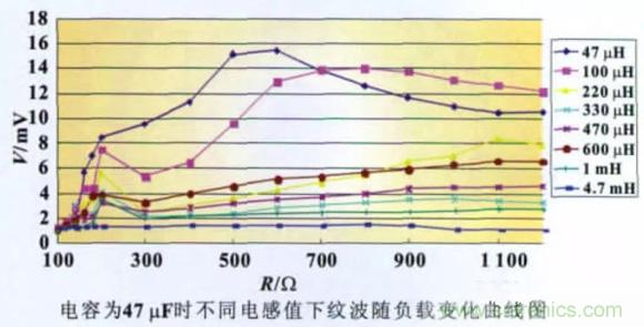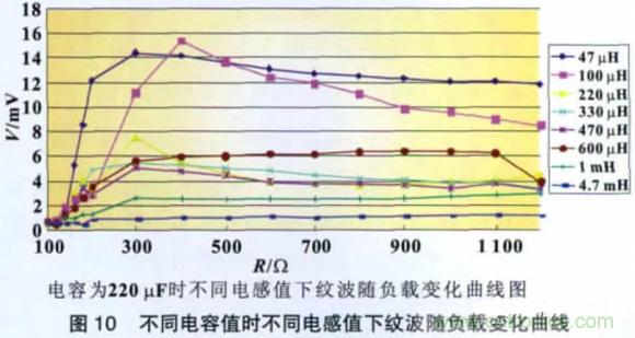 圖10 所示為在不同電容值(貼片鉭電解)下,改變電感和負(fù)載并測(cè)量負(fù)載上的電源紋波有效值所得出的曲線(xiàn)圖。
