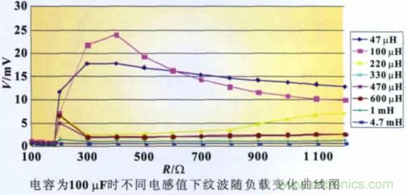 2.2.3 不同電感值下紋波隨負(fù)載的變化