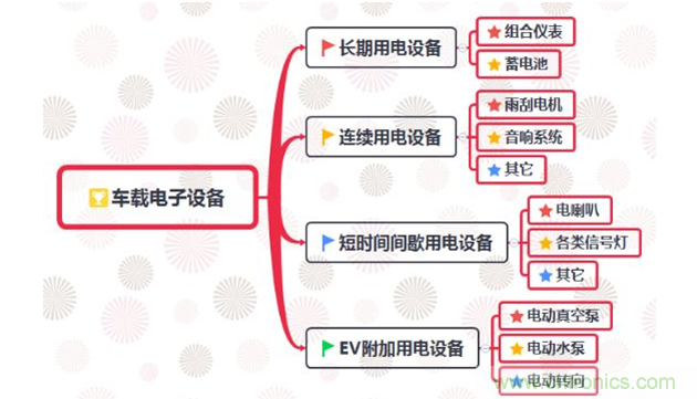 作為電動汽車的供電設備,DC/DC變換器也給車載電子設備供電。根據(jù)純電動汽車車載電子設備不同屬性,可把用電設備分為長期用電設備、連續(xù)用電設備、短時間間歇用電設備和EV附加用電設備等四種類型,如下圖所示。同時,DC/DC變換器的體積和種類都很小且輸出穩(wěn)定。