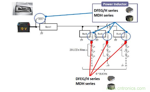 在汽車應用中,目前車燈廣泛采用LED光源,因此會用到Boost DC/DC和Buck DC/DC等轉(zhuǎn)換器。