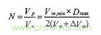 變壓器的變比與變換器的傳輸功率、主電路拓撲結(jié)構(gòu)以及占空比相關(guān)。越大,變壓器原邊的電流越小,原邊總的損耗越小,同時副邊整流管要承受的電壓應力也越小,變壓器的效率越高。同時,應能滿足在所有輸入電壓范圍內(nèi)都能得所需要的輸出電壓,因此,在計算變壓器變比的時候應考慮在最小輸入電壓情況下輸出滿載且占空比最大進行。
