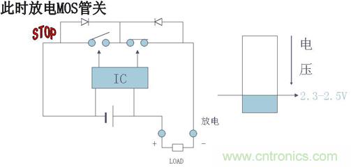 在電池放電過程中,當控制IC檢測到電池電壓低于2.3V(該值由控制IC決定,不同的IC有不同的值)時,其“DO”腳將由高電壓轉(zhuǎn)變?yōu)榱汶妷?,使T2由導(dǎo)通轉(zhuǎn)為關(guān)斷,從而切斷了放電回路,使電池無法再對負載進行放電,起到過放電保護作用。而此時由于T2自帶的體二極管VD2的存在,充電器可以通過該二極管對電池進行充電。