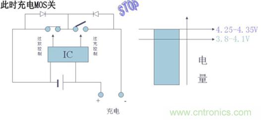 電池在被充電過程中,如果充電器電路失去控制,會使電池電壓超過4.2V后繼續(xù)恒流充電,此時電池電壓仍會繼續(xù)上升,當電池電壓被充電至超過4.3V時,電池的化學(xué)副反應(yīng)將加劇,會導(dǎo)致電池損壞或出現(xiàn)安全問題。