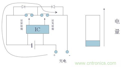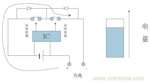 在帶有保護電路的電池中,當控制IC檢測到電池電壓達到4.28V(該值由控制IC決定,不同的IC有不同的值)時,其“CO”腳將由高電壓轉(zhuǎn)變?yōu)榱汶妷?,使T1由導(dǎo)通轉(zhuǎn)為關(guān)斷,從而切斷了充電回路,使充電器無法再對電池進行充電,起到過充電保護作用。而此時由于T1自帶的體二極管VD1的存在,電池可以通過該二極管對外部負載進行放電。
