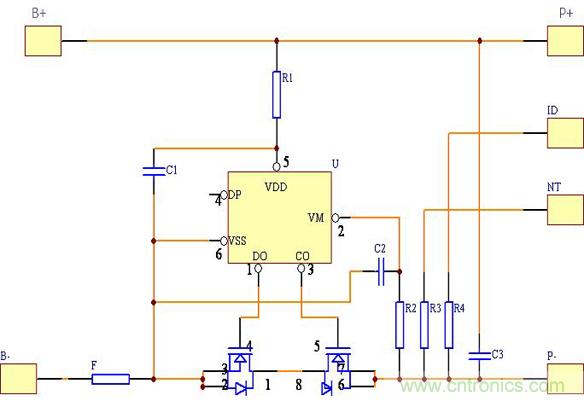 該保護回路由兩個MOSFET(T1、T2)和一個控制IC(N1)外加一些阻容元件構(gòu)成??刂艻C負責監(jiān)測電池電壓與回路電流,并控制兩個MOSFET的柵極,MOSFET在電路中起開關(guān)作用,分別控