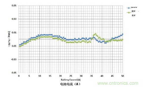 許多因素都會(huì)影響系統(tǒng)精度,包括溫度漂移、電壓漂移和偏移電壓。電池測(cè)試儀參考設(shè)計(jì)使用三點(diǎn)校準(zhǔn)來(lái)計(jì)算不同的影響來(lái)源或任何錯(cuò)誤。圖2顯示了在寬電流范圍內(nèi)實(shí)現(xiàn)的滿(mǎn)量程精度。該系統(tǒng)在電池充電時(shí)以降壓模式運(yùn)行,放電時(shí)以升壓模式運(yùn)行。