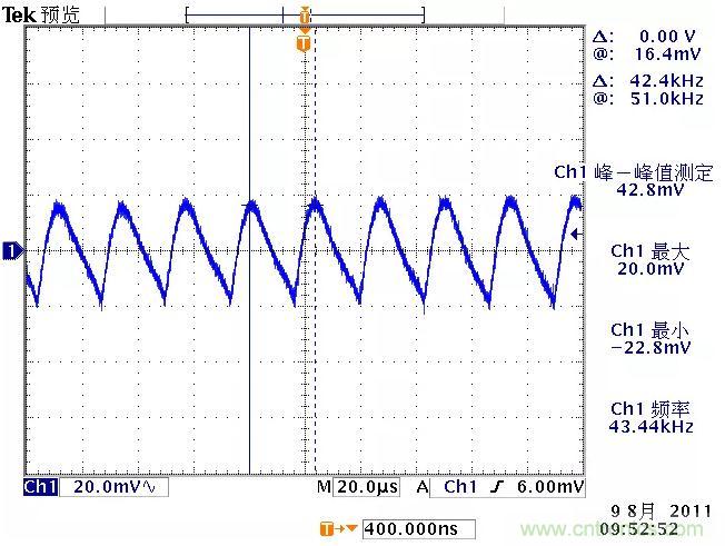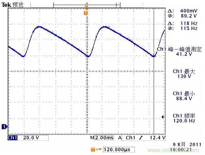 低頻紋波是與輸出電路的濾波電容容量相關(guān)。由于開(kāi)關(guān)電源體積的限制,電解電容的容量不可能無(wú)限制地增加,導(dǎo)致輸出低頻紋波的殘留,該輸出紋波頻率隨整流電路方式的不同而不同。