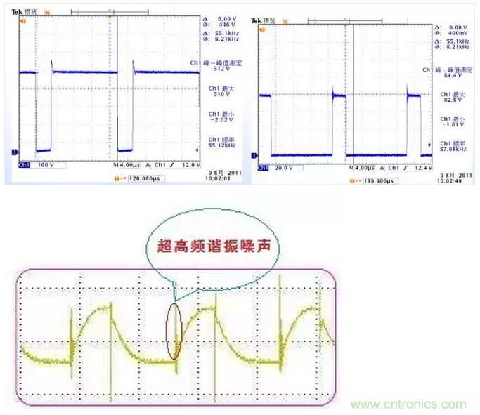 超高頻諧振噪聲主要來(lái)源于高頻整流二極管反向恢復(fù)時(shí)二極管結(jié)電容、功率器件開(kāi)關(guān)時(shí)功率器件結(jié)電容與線路寄生電感的諧振,頻率一般為1~10MHz,通過(guò)選用軟恢復(fù)特性二極管、結(jié)電容小的開(kāi)關(guān)管和減少布線長(zhǎng)度等措施可以減少超高頻諧振噪聲。