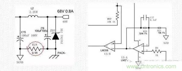 工作原理:R18為回路的電流檢測電阻,為了降低損耗,此電阻選擇時盡量的小。U5為運算放大器LM358,358內(nèi)部由兩個運放,我們將兩個運放一個做放大器,一個做比較器,將檢測電阻上的電壓值放大32.4倍后與基準電壓做比較。當運放值低于基準值時,比較器輸出高電平(358VCC電壓),當運放值高于基準電壓值時,比較器輸出低電平(相對于接地).