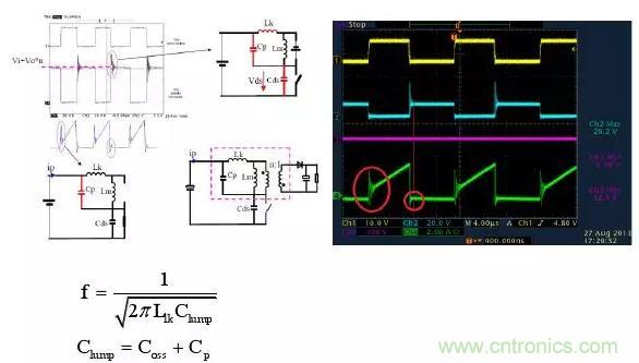 當(dāng)次級電感電流降到了零。這意味著磁芯中的能量已經(jīng)完全釋放了。那么因為二管電流降到了零,二極管也就自動截止了,次級相當(dāng)于開路狀態(tài),輸出電壓不再反射回初級了。由于此時MOS的Vds電壓高于輸入電壓,所以在電壓差的作用下,MOS的結(jié)電容和初級電感發(fā)生諧振。諧振電流給MOS的結(jié)電容放電。Vds電壓開始下降,經(jīng)過1/4之一個諧振周期后又開始上升。由于RCD箝位電路以及其它寄生電阻的存在,這個振蕩是個阻尼振蕩,幅度越來越小。