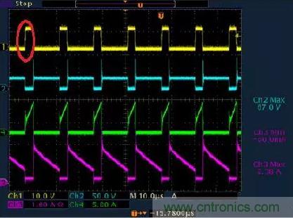 不管是在CCM模式還是DCM模式,在mosfet開通on時刻,變壓器副邊都有震蕩。主要原因是初次及之間的漏感+輸出肖特基(或快恢復(fù))結(jié)電容+輸出電容諧振引起,在CCM模式下與肖特基的反向恢復(fù)電流也一些關(guān)系。故一般在輸出肖特基上并聯(lián)-一個RC來吸收,使肖特基應(yīng)力減小。