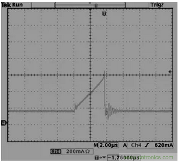32.反激拓補(bǔ)結(jié)構(gòu),變壓器B值需小于3500高斯,如果變壓器飽和一切動(dòng)作將會(huì)失控,如下,上圖為正常,下圖為飽和。