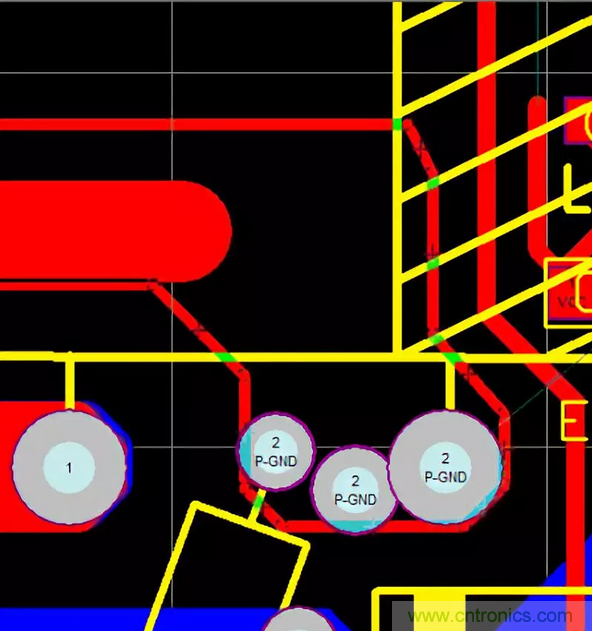 47.PCB的熱點(diǎn)區(qū)域一定要遠(yuǎn)離輸入、輸出端子,防止噪聲源串到線上導(dǎo)致EMI變差,在不得已而為之時(shí),可增加地線或其它屏蔽方式進(jìn)行隔離,如下圖增加了一條地線進(jìn)行有效隔離。