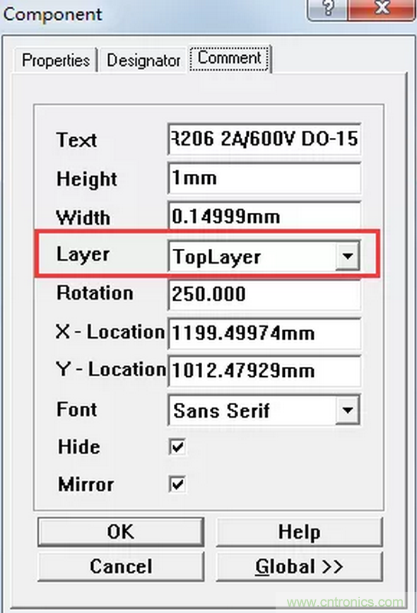 D1這個(gè)元件有個(gè)文字描述的屬性放在了頂層銅箔,如圖