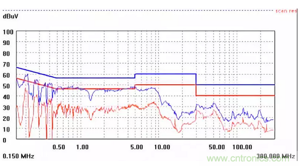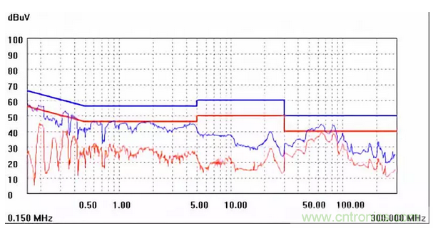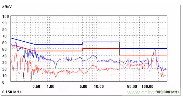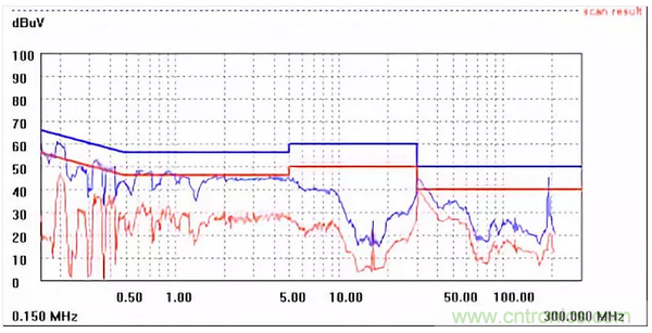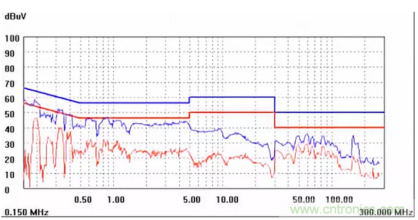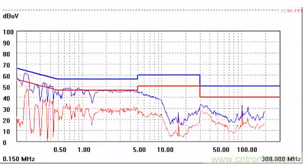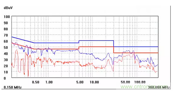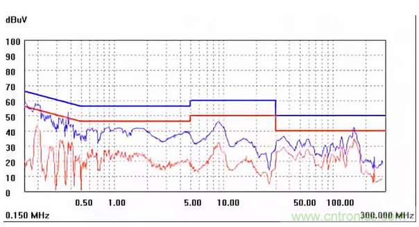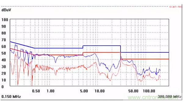圖一a可以看出,改變PCB布局后130M-200M已經(jīng)完全被衰減,但是30-130M沒(méi)有圖一效果好,可能變壓器出線無(wú)交叉好一些。仔細(xì)觀察,此IC具有抖頻功能,傳導(dǎo)部分頻段削掉了一些尖峰;