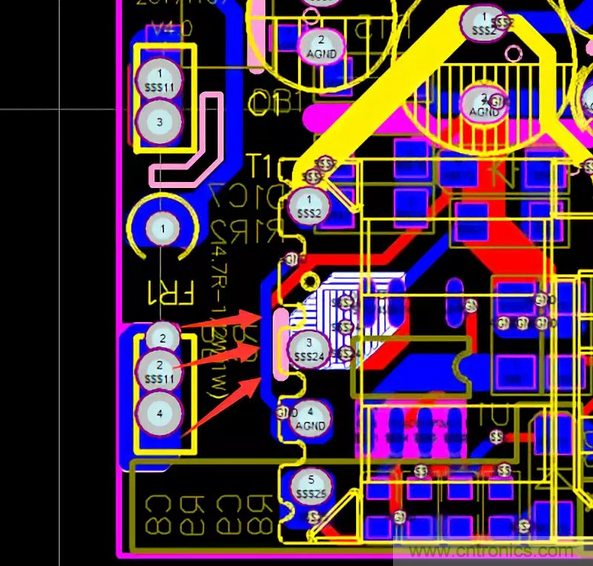 46.在畫(huà)PCB定義變壓器腳位時(shí),要考慮到變壓器的進(jìn)線和出線是否會(huì)交叉,因?yàn)楦骼@組之間的繞線在邊界處存在有45-90度的交叉,需在交叉出線處加一個(gè)套管到pin腳。