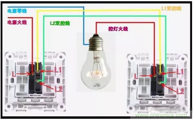 有的朋友說中間可不可以用雙聯(lián)雙控開關,也是可以的。不過雙聯(lián)開關上有兩個開關,需用同時按下。
