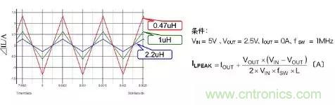 在這里,為加深對(duì)電感工作的理解,進(jìn)一步說(shuō)明電感值變化時(shí)電感電流如何變化的情形。下圖表示在相同工作條件下將電感值設(shè)為0.4μH、1μH、2.2μH時(shí)ILPEAK。