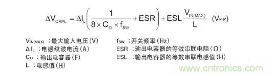 以下是表示輸出紋波電壓的公式。電容器的紋波電壓和ESR的紋波由于相位偏離,故無(wú)法進(jìn)行單純的加算,不過(guò)卻是紋波電壓的最差值概算常用的公式。
