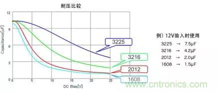 關(guān)于DC偏置,當(dāng)然須選擇影響少的,不過(guò)即使電容值、耐壓相同,變動(dòng)特性也會(huì)因封裝尺寸而異。下方圖表為其一例,顯示尺寸大者變動(dòng)少。總之,請(qǐng)務(wù)必從電容器廠商取得充分的信息。