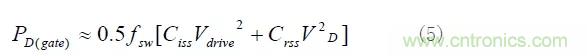 功率MOSFET驅動效率比雙極型功率晶體管高。MOSFET柵極有兩個與漏源極相連的等效電容,即柵源電容Ciss和漏源電容Crss。MOSFET柵極驅動的損耗來自于開通MOSFET時輔助電壓對柵極電容的充電,關斷MOSFET時又對地放電。柵極驅動損耗計算由式(5)給出。