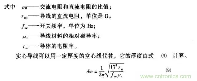 電阻損耗是變壓器或電感內部繞組的電阻產生的損耗。有兩種形式的電阻損耗:直流電阻損耗和集膚效應電阻損耗。直流電阻損耗由繞組導線的電阻與流過的電流有效值二次方的乘積所決定。集膚效應是由于在導線內強交流電磁場作用下,導線中心的電流被“推向”導線表面而使導線的電阻實際增加所致,電流在更小的截面中流動使導線的有效直徑顯得小了。式(8)給出了這兩個損耗在一個表達式中的計算式。