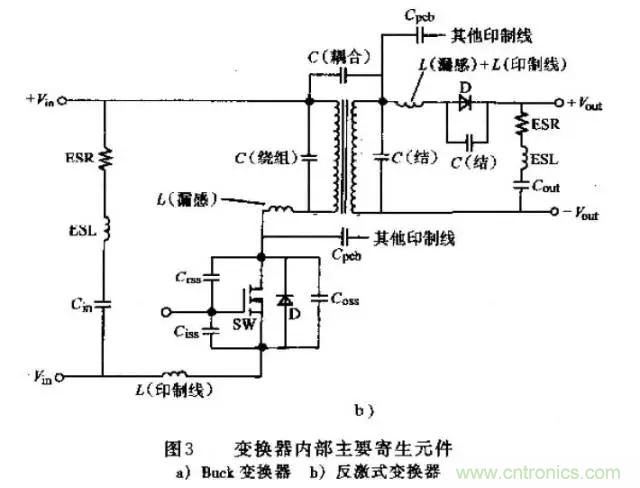 在所有開關電源中,有一些常見的寄生參數,在觀察變換器內主要交流節(jié)點的波形時,可以明顯看到它們的影響。有些器件的數據資料中,甚至給出了這些參數,如MOSFET的寄生電容。兩種常見變換器的主要寄生參數見圖3。