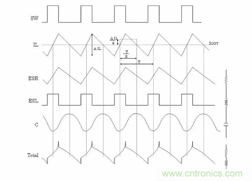 通過(guò)開(kāi)關(guān)所產(chǎn)生的電感電流紋波ΔIL將產(chǎn)生與ESR成單純正比的紋波電壓,有些ESL則會(huì)產(chǎn)生方形波電壓,與電容值部分合成,最下方波形成為最終的輸出紋波電壓波形。