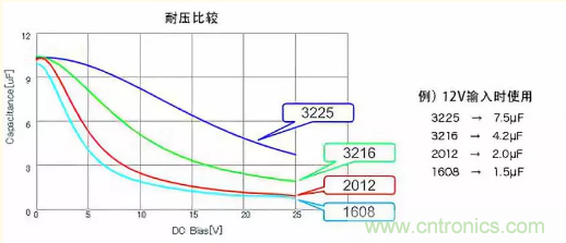 關(guān)于DC偏置,當(dāng)然須選擇影響少的,不過(guò)即使電容值、耐壓相同,變動(dòng)特性也會(huì)因封裝尺寸而異。下方圖表為其一例,顯示尺寸大者變動(dòng)少??傊?qǐng)務(wù)必從電容器廠商取得充分的信息。