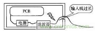 許多設(shè)備的電源線進(jìn)入機(jī)箱后,經(jīng)過(guò)很長(zhǎng)的導(dǎo)線才接到濾波器的輸入端。例如,電源線從機(jī)箱后面板輸入,走行到前面板的電源開(kāi)關(guān),又回到后面板接到濾波器?;蛘邽V波器的安裝位置距離電源線入口較遠(yuǎn),造成引線太長(zhǎng)(如圖1所示)。