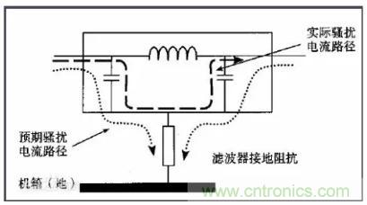 由于接地線較長(zhǎng),在高頻時(shí)導(dǎo)線的分布電感不能忽視。如果濾波器搭接良好,干擾信號(hào)可以通過(guò)殼體直接接地。如果濾波器的殼體和機(jī)箱之間搭接不良,相當(dāng)于濾波器的殼體(地)與機(jī)箱之間存在一個(gè)分布電容,這將導(dǎo)致濾波器高頻時(shí)接地阻抗較大,尤其在分布電感和分布電容諧振的頻率附近,接地阻抗趨于無(wú)窮。