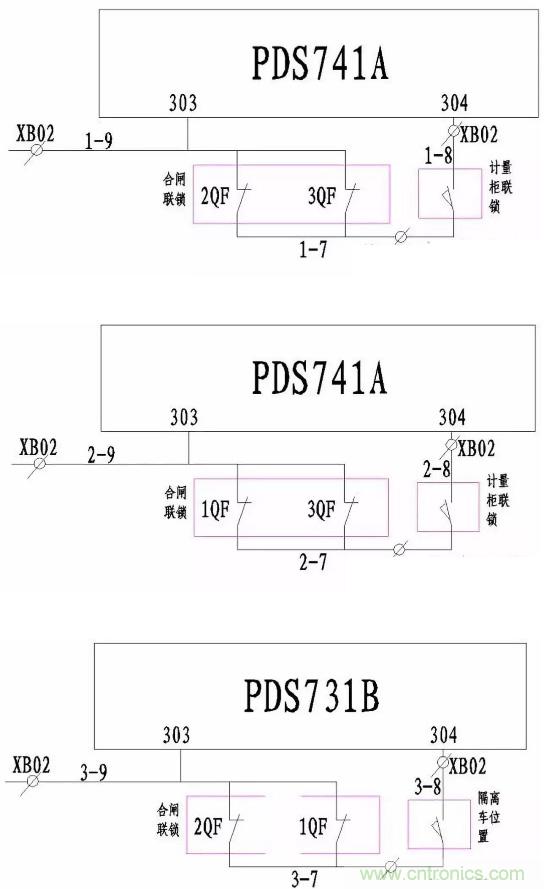 在計(jì)量柜與母聯(lián)隔離柜都到位的情況下,合1QF與2QF。這時(shí)PDS731B的3-7與3-9處于分?jǐn)嗟臓顟B(tài),其304端子無電源,3QF不滿足合閘條件。同理,1QF與3QF合閘時(shí),2QF不滿足合閘條件;2QF與3QF合閘時(shí),1QF不滿足合閘條件。