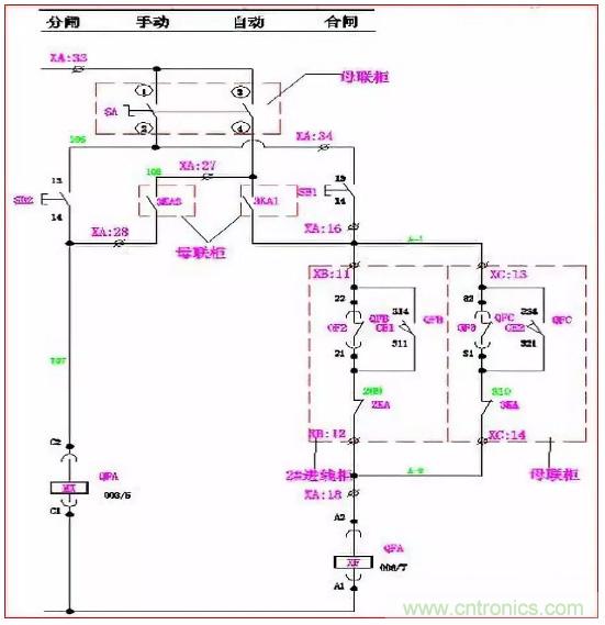 手動(dòng)時(shí):萬轉(zhuǎn)SA的1、2腳連通。當(dāng)Q2、Q3合閘,Q1合閘回路A-2、A-3斷開,其合閘線圈XF無法得電, Q1不能滿足合閘條件;同理,當(dāng)Q1、Q2或Q1、Q3同時(shí)合閘時(shí),Q2或Q3也同樣不能滿足合閘條件。使進(jìn)線柜與母聯(lián)滿足“三合二”邏輯。