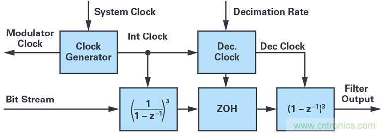 傳統(tǒng)的三階sinc濾波器如圖1所示。濾波器通過按比例縮放系統(tǒng)時鐘來生成ADC的調(diào)制器時鐘,而ADC則向濾波器返回一個1位數(shù)據(jù)流。濾波器功能本身包括三階級聯(lián)積分器 1/(1 – z–1)(時鐘速率與調(diào)制器速率相同)和三階級聯(lián)微分器 1 – z–1(時鐘速率為抽取時鐘)。