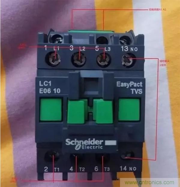 如上圖所示,接觸器共有六個(gè)主觸點(diǎn),1,3,5為主觸點(diǎn)進(jìn)線(xiàn)孔,2,4,6為主觸點(diǎn)出線(xiàn)孔,A1,A2為接觸器