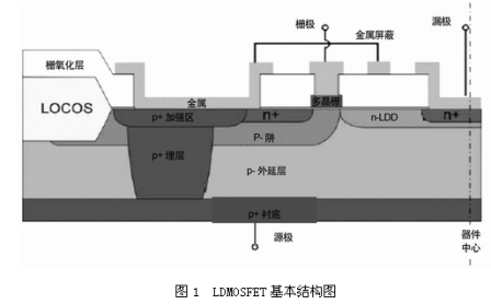 RF功率LDMOSFET是具有橫向溝道結構的功率MOSFET,它以LDMOSFET為基本結構,利用雙擴散技術在同一窗口相繼進行硼、磷兩次擴散,通過兩種雜質(zhì)橫向擴散的結深之差精確控制溝道長度。其基本結構如圖1所示,由幾個關鍵結構組成: