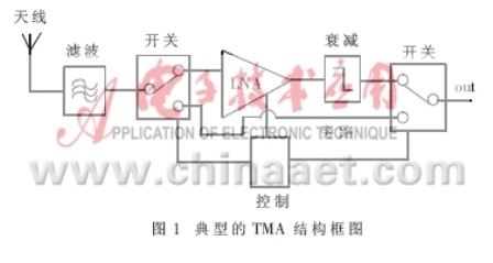 很多情況下,因?yàn)榛九c移動(dòng)設(shè)備不平衡連接的緣故,從基站到移動(dòng)設(shè)備的信號(hào)強(qiáng)度和傳輸距離都要超過移動(dòng)設(shè)備向基站的反向傳輸,并且由于天線與基站間的反饋損耗,使得這種不平衡性變得更大。為了改善這種不平衡性,擴(kuò)大基站接收的覆蓋面,最直接的解決方案是加裝塔裝放大器TMA或Masthead放大器。而TMA中最重要的模塊LNA(如圖1所示)對(duì)接收的信號(hào)具有選頻功能,并把選頻后的信號(hào)進(jìn)行低噪聲放大,使系統(tǒng)靈敏度增強(qiáng),覆蓋半徑增大。
