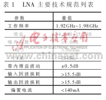 為使圖2中的LNA模塊噪聲系數(shù)。截點(diǎn)和增益達(dá)到表1中的各項(xiàng)指標(biāo),設(shè)計(jì)漏極電流Id=60mA?同時(shí),要求單個(gè)放大元件在此偏置點(diǎn)的工作性能達(dá)到優(yōu)于表1的規(guī)范值。由于E-pHEMT元件ATF-54143在電流Id=60mA下,具有最佳的截點(diǎn)(IP3)和最小噪聲系數(shù)Fmin;漏源極電壓Vds為3V時(shí),具有稍高的增益;偏置是+5V穩(wěn)定電壓,所需單極性+3V電壓更具有優(yōu)勢(shì),因此選擇其作為放大元件。