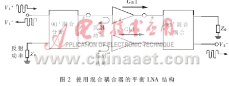 通常,在LNA的設(shè)計(jì)中主要考慮低噪聲系數(shù)(NF)。足夠的增益(G)和絕對(duì)的穩(wěn)定性?對(duì)于本文TMA放大器中LNA設(shè)計(jì)的實(shí)際技術(shù)規(guī)范要求如表1所示。同時(shí)要求所使用的LNA結(jié)構(gòu)滿足良好的輸入輸出匹配,保證LNA的穩(wěn)定性,兼顧到功分/合路網(wǎng)絡(luò)的低損耗、幾何尺寸小,工作帶寬內(nèi)良好的相位和幅度匹配,足夠的工作帶寬(涵蓋在1.95GHz左右),符合CDMA標(biāo)準(zhǔn)上行頻率?據(jù)此選擇了以平衡結(jié)構(gòu)為特征的LNA結(jié)構(gòu)(如圖2)。這種平衡結(jié)構(gòu)的重要特性是:它較單階放大器的截點(diǎn)高出一倍,并以標(biāo)準(zhǔn)50Ω實(shí)現(xiàn)輸入輸出匹配,在某一路硬件失效時(shí)電路的冗余設(shè)計(jì)可保證系統(tǒng)的正常運(yùn)行。但通常增益減少6dB。