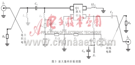 因規(guī)范要求NF最大值只有1dB,為實(shí)現(xiàn)放大器的最佳噪聲匹配,網(wǎng)絡(luò)采用高通阻抗匹配。放大電路原理圖如圖3所示,它的輸入匹配網(wǎng)絡(luò)由一個(gè)串聯(lián)的電容C1和兩個(gè)并聯(lián)的電感L1和L2組成。因電路損耗將直接與噪聲系數(shù)相關(guān),這樣L1和L2的高Q值則變得非常重要。短路電感L1能夠在低頻端提供增益衰減,同時(shí)又與C1一起作為輸入匹配阻抗的一部分,C1同時(shí)要作為直流隔斷電容。L2還要為pHEMT做偏置電感,在柵極加入電壓偏置,它要求有一個(gè)好的旁路電容C2。這個(gè)網(wǎng)絡(luò)是對(duì)于低噪聲系數(shù)。輸入回波損耗和增益都加以兼顧考慮的方案,電容C2。C4保證帶內(nèi)的穩(wěn)定性,低頻端電阻R3。R4作為阻性終端以保證低頻時(shí)系統(tǒng)的穩(wěn)定性。輸出高通匹配網(wǎng)絡(luò)由C4和L3組成,分路電感L3的作用與L2相同,作為pHEMT管偏置載入電感,在漏極偏置。