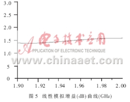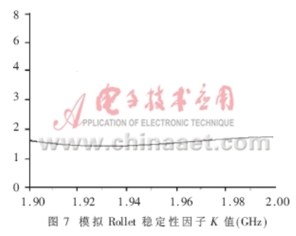 除了能夠得出增益、NF、P1dB和輸入輸出回波等重要參數(shù)外,軟件模擬還能夠得出關(guān)于電路設(shè)計(jì)穩(wěn)定性的信息。它是電路能否正常工作的重要前提。模擬軟件計(jì)算Rollet穩(wěn)定性因子K和作穩(wěn)定性圓是兩種很容易做到的方法,它們可以明確地表示出穩(wěn)定性的數(shù)據(jù)。圖7示出的Rollett穩(wěn)定因子K的模擬值(K>1)表明:在1.9~2.0GHz工作帶寬范圍,電路能夠?qū)崿F(xiàn)無條件穩(wěn)定。